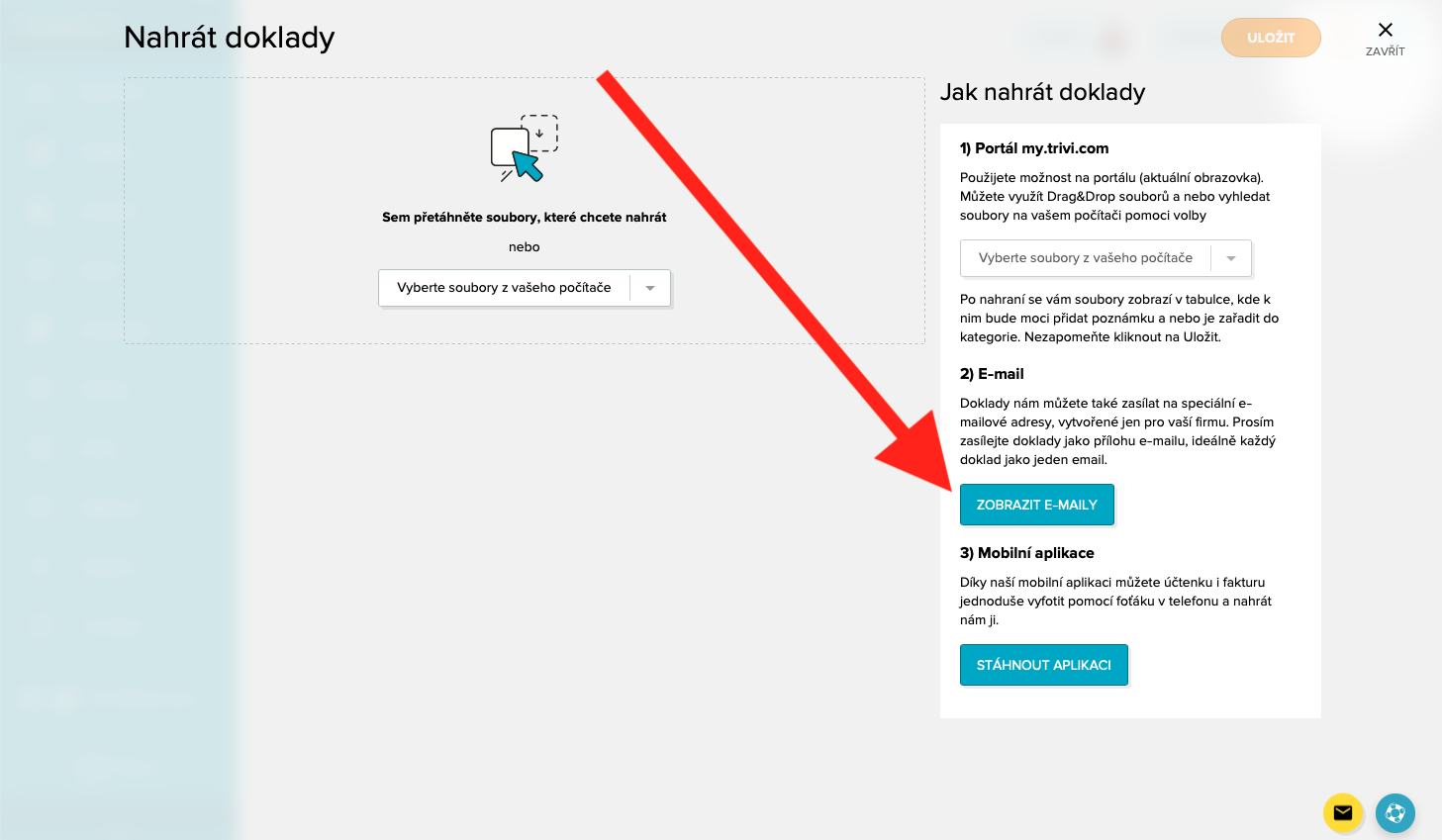 V sekci "Nahrát doklady" (kde sekci najdete je popsáno v bodě 1) klikněte na "ZOBRAZIT E-MAILY".