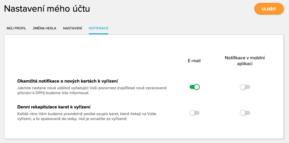 - Webovém portálu (Ikonka uživatele v pravém horním rohu -> Nastavení mého účtu -> Notifikace)
