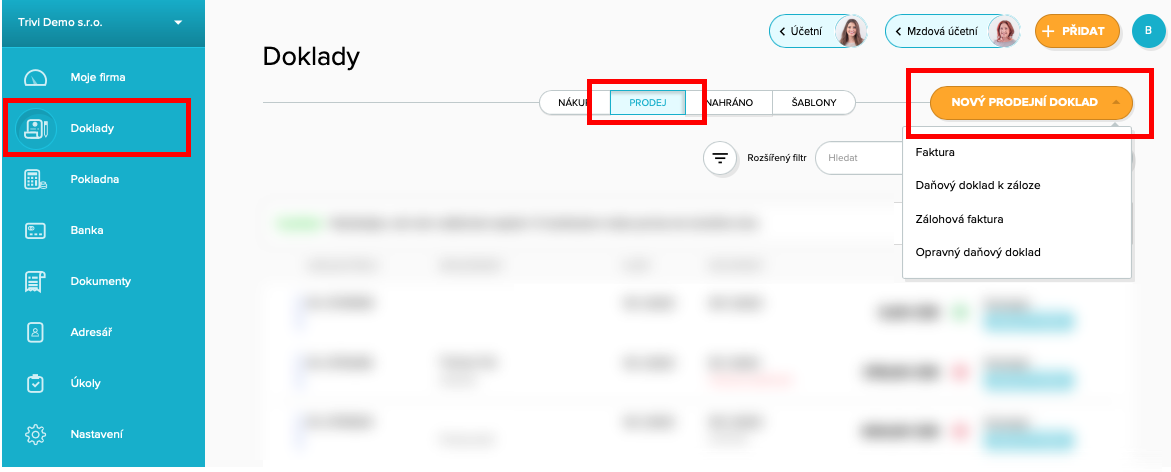 Vyberte sekci Doklady v levém menu a následně v horním menu vyberte sekci Prodej. V levém horním rohu máte kliknutím na „Nový prodejní doklad“ možnost vybrat jeden z typů prodejních dokladů.