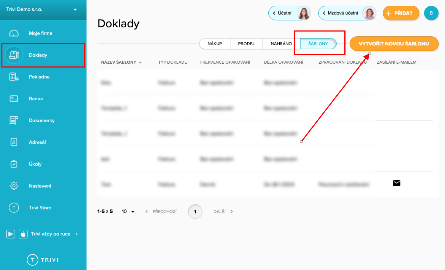 Pro zjednodušení opakovaného vystavování dokladů máte na portálu Trivi možnost využít funkce Šablon. Můžete si vytvořit šablonu pro každý doklad, který vystavujete pravidelně, a následně využít tyto šablony ručně, kdykoliv potřebujete další podobný doklad. Portál Trivi Vám taktéž umožní nastavit automatické vytváření dokladů ze šablon dle nastavených parametrů.