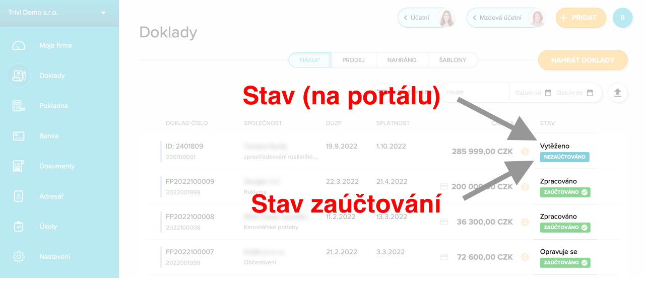 Obecně rozlišujeme na portálu dva stavy. Stav (na portálu) a Stav zaúčtování. Stav na portálu je stav dokladu předtím, než je odeslán do účetního modulu Trivi k zaúčtování. Jakmile je odeslán do účetního modulu, proběhnou poslední validace, a stane se součástí Vašeho účetnictví.