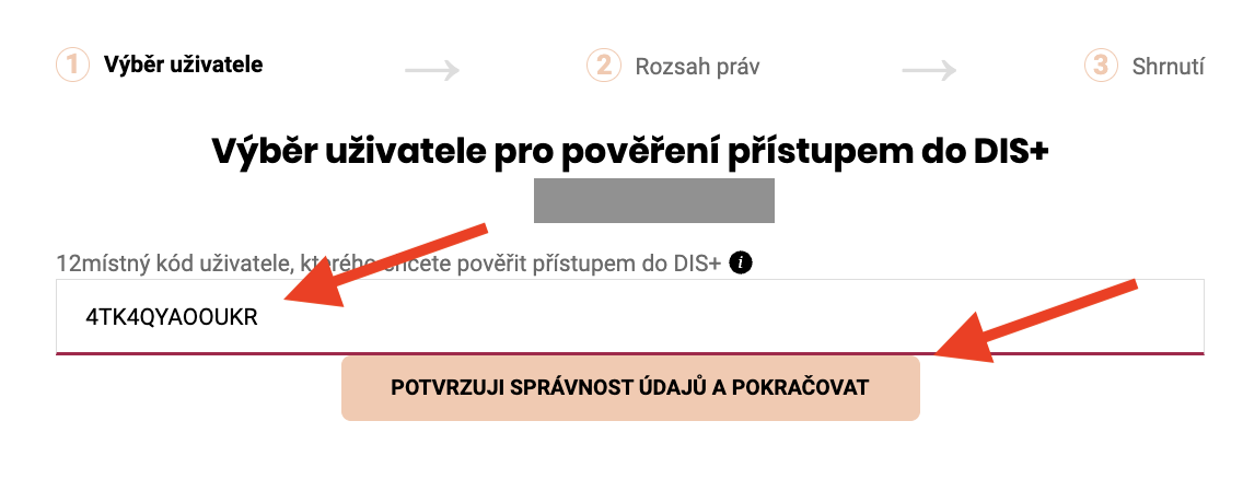 9. Do pole pro identifikaci uživatele zadejte dvanáctimístný kód: 4TK4QYAOOUKR a potvrďte správnost údajů.