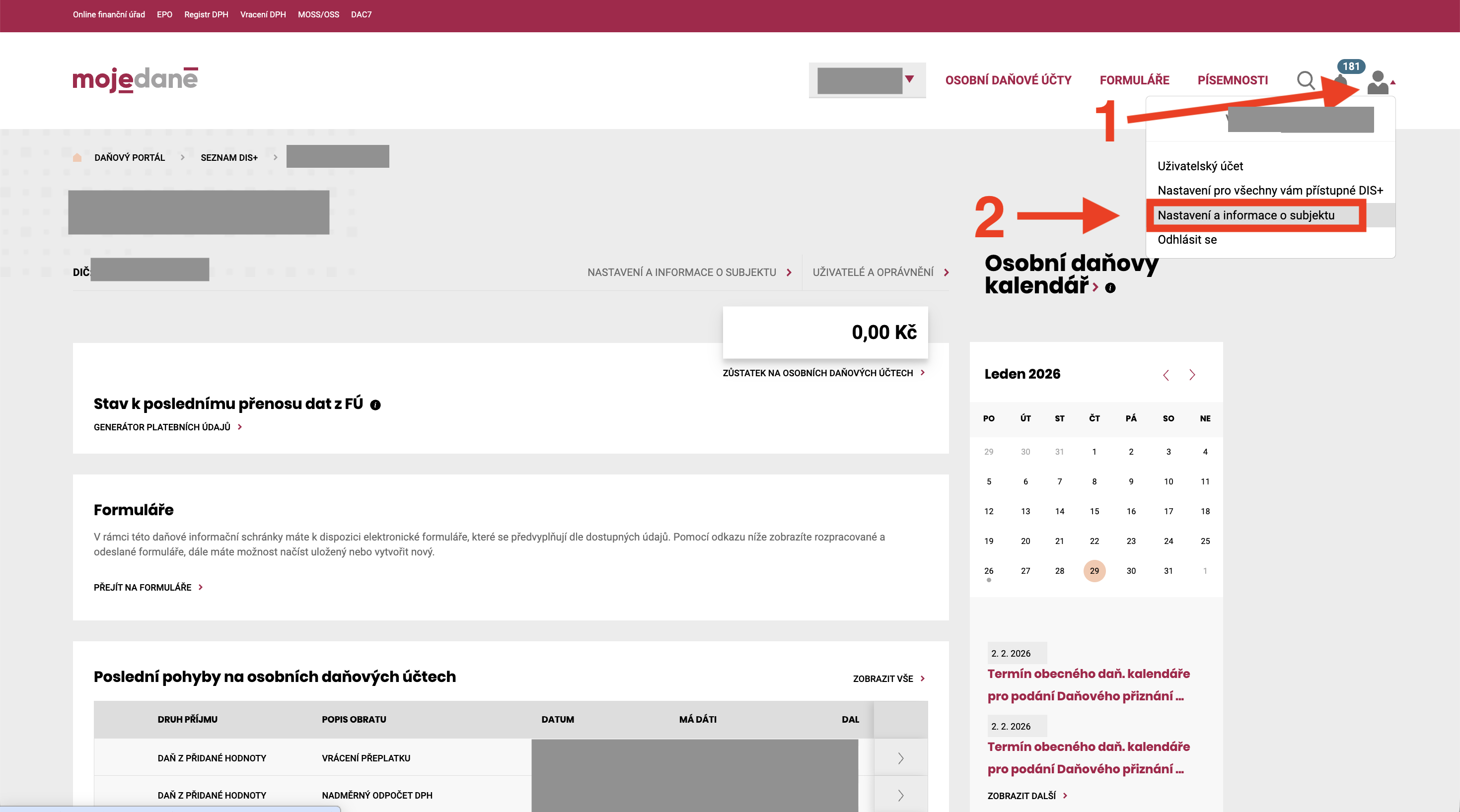 6. Otevřete sekci Nastavení a informace o subjektu, která se zobrazí po kliknutí na ikonku profilu v horním pravém rohu.