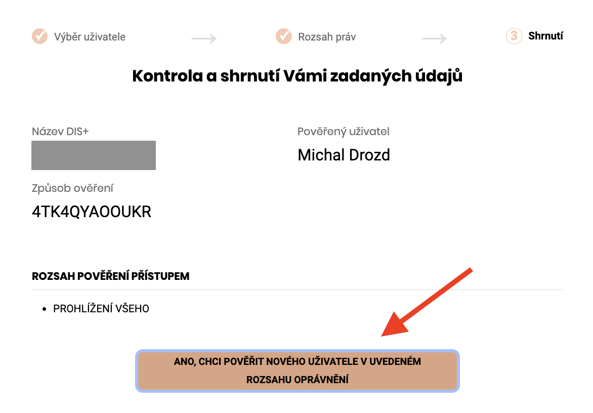 11. Zkontrolujte shrnutí a potvrďte volbou Ano, chci pověřit nového uživatele v uvedeném rozsahu oprávnění.