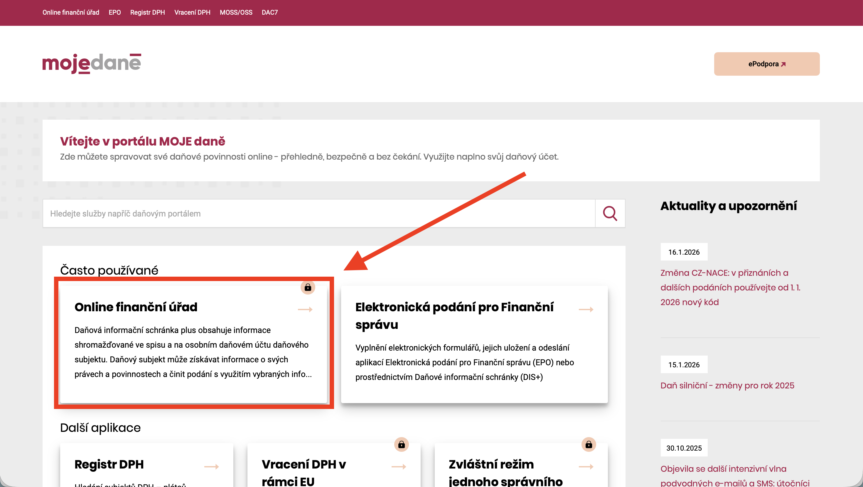 1. Otevřete webové stránky Portálu MOJE daně: https://www.mojedane.cz.